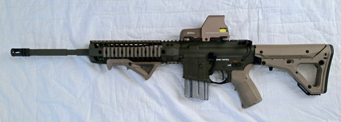 - Lower assembled, Spikes upper Cerakoated ODG to match lower in ODG, added Magpul XTM hand-stop kit on lower rail along with black rail ladders. MagPul UBR stock and Grip