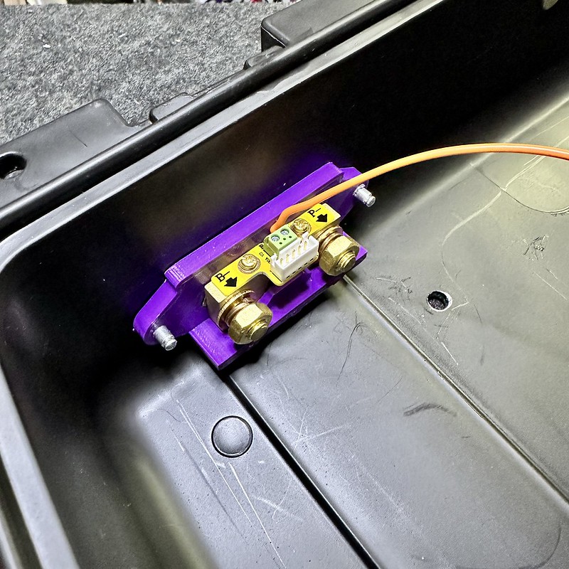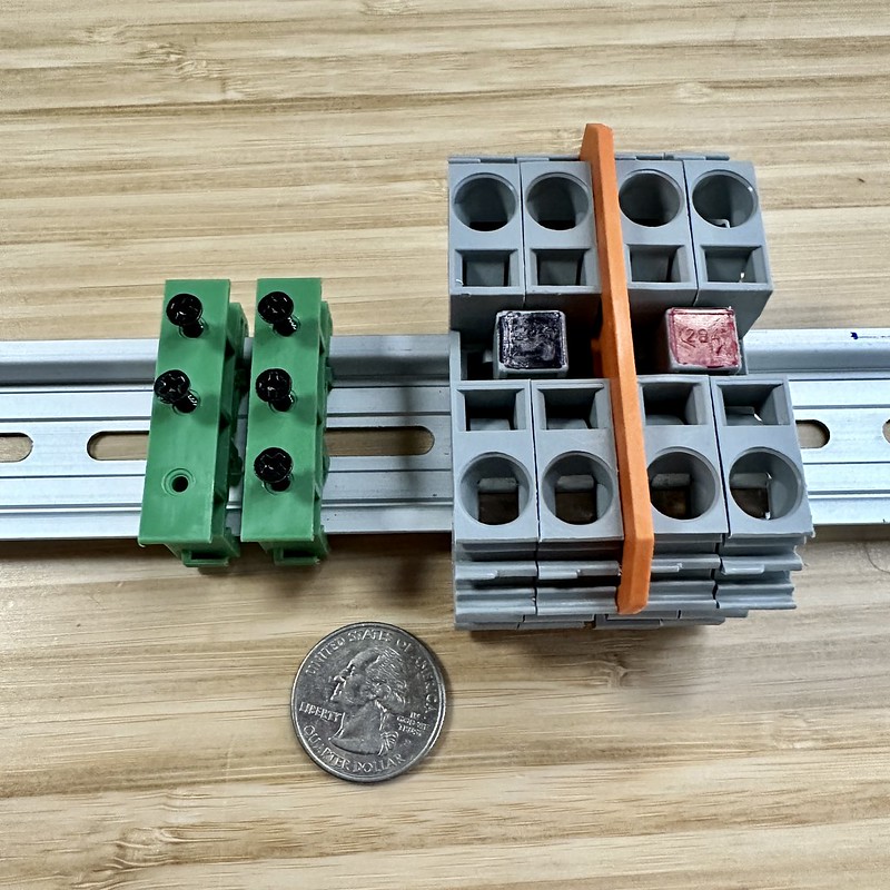I decided to use a 35mm DIN rail and terminal blocks to mount cross connects to connect everything together – I had originally planned on mounting the shunt for the AMP meter on the DIN rail as well but later decided to mount that to the top front side of the case after having a custom 3D-printed mount made for it (Thanks to KF5ZBL for printing):